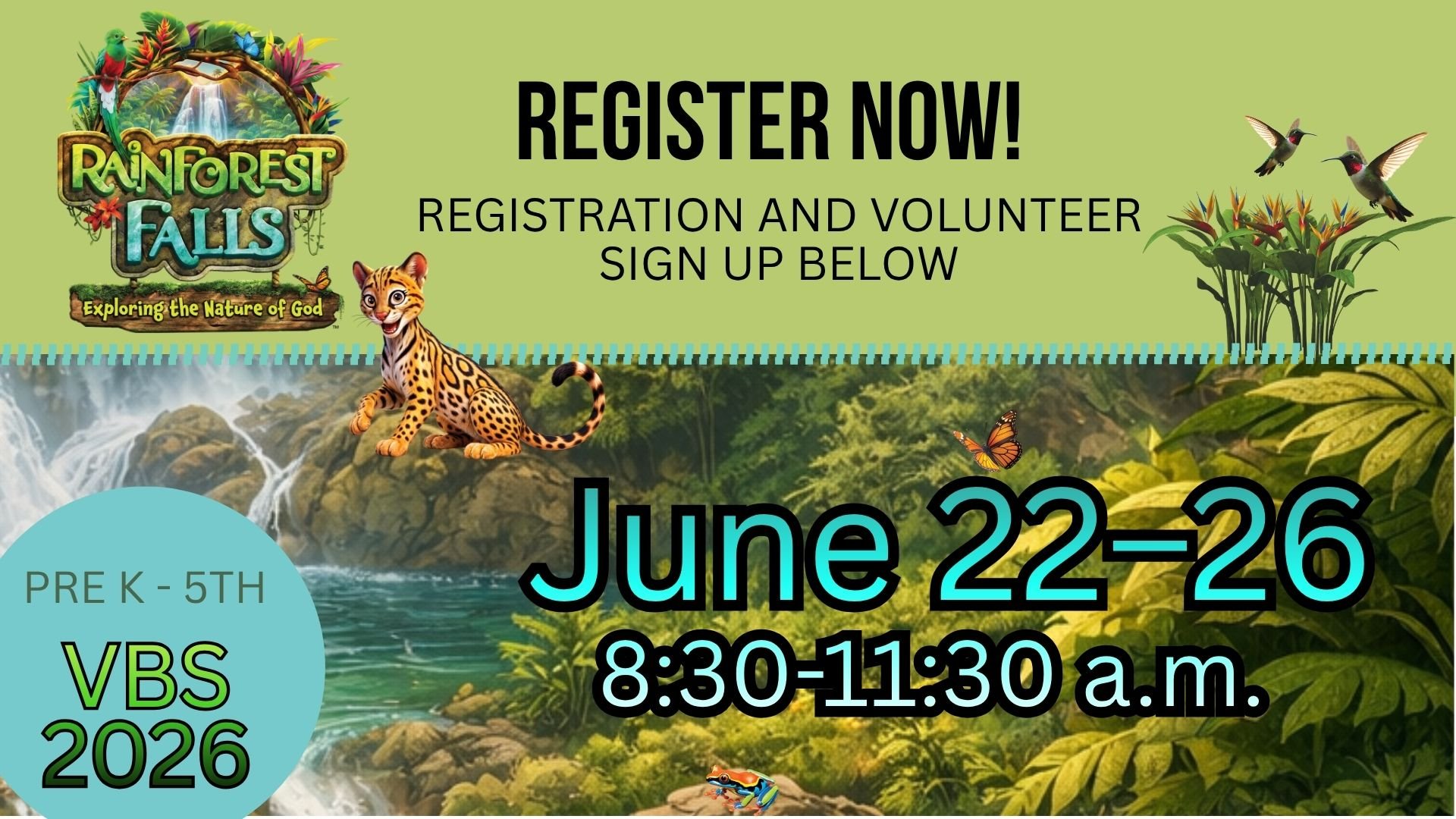 Step into an unforgettable adventure at Rainforest Falls VBS! June 22–26 | 8:30–11:30 AM